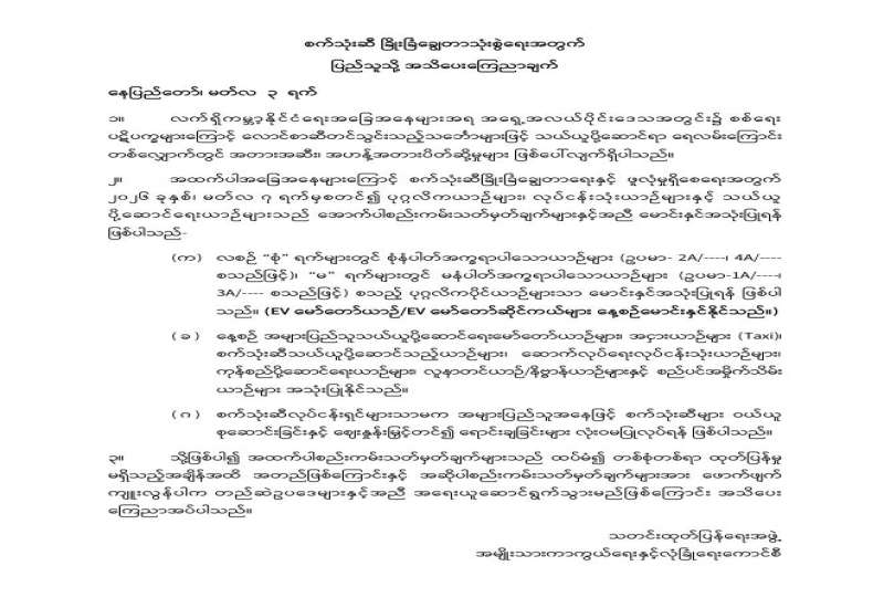 စက်သုံးဆီ ခြိုးခြံချွေတာသုံးစွဲရေးအတွက် ပြည်သူသို့ အသိပေးကြေညာချက်အား ဖြည့်စွက်ထုတ်ပြန်ခြင်း