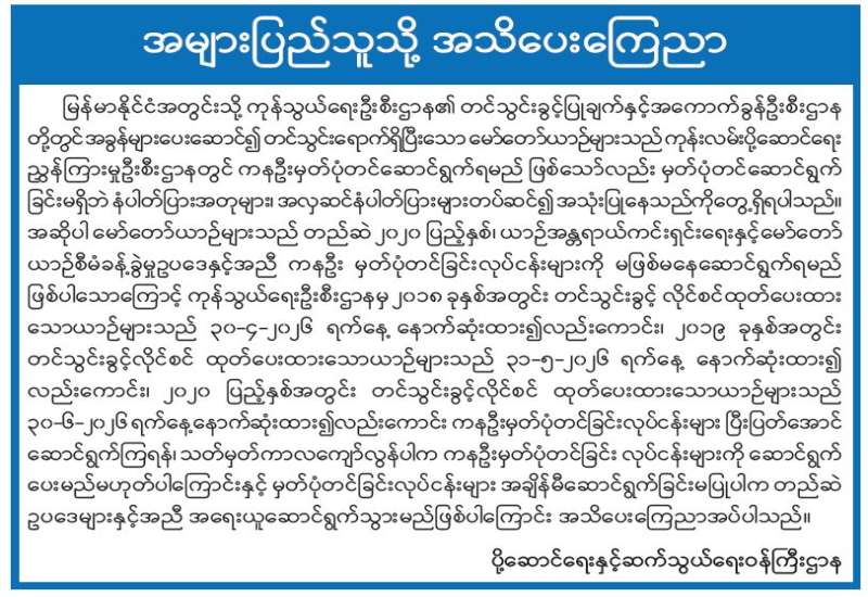 စက်သုံးဆီ ခြိုးခြံချွေတာသုံးစွဲရေးအတွက် ပြည်သူသို့ အသိပေးကြေညာချက်