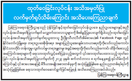 ထုတ်ဝေခြင်းလုပ်ငန်း အသိအမှတ်ပြုလက်မှတ် ရုပ်သိမ်းကြောင်း အသိပေးကြေညာချက်