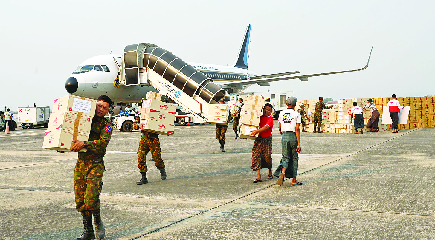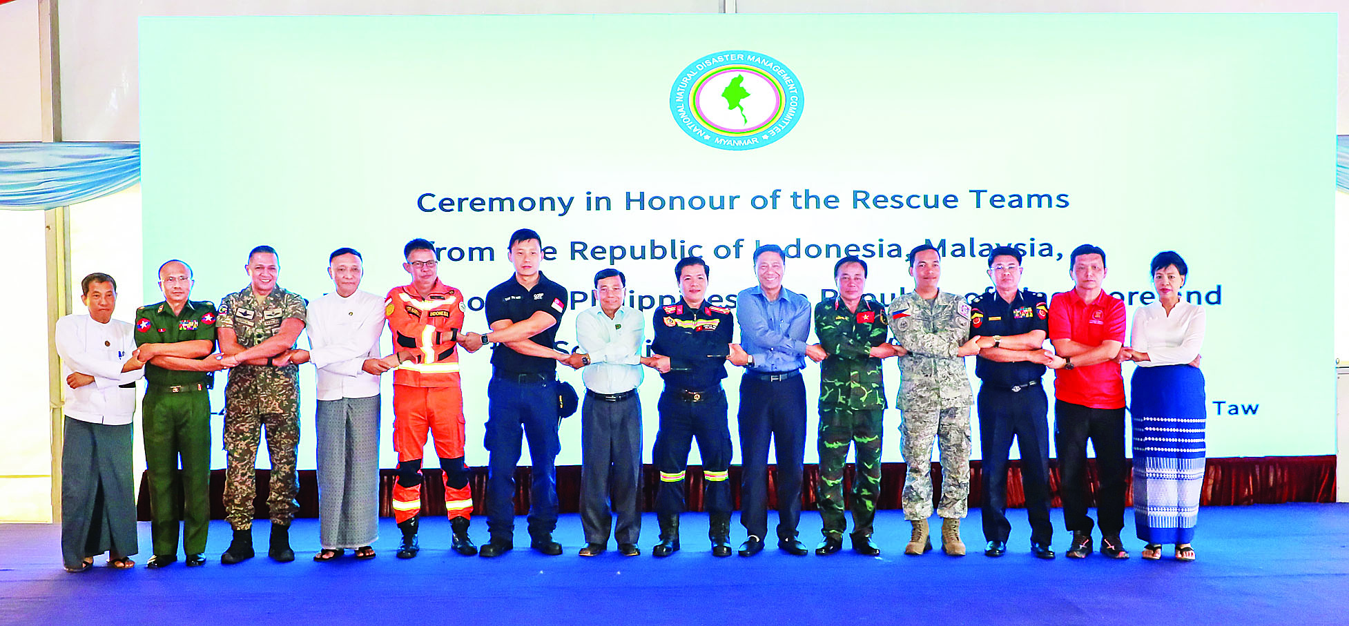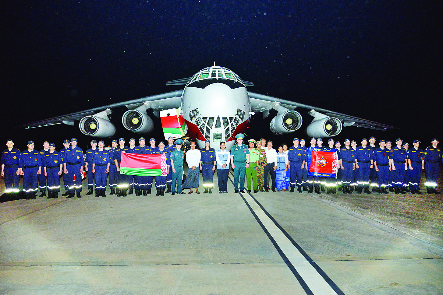 မြန်မာနိုင်ငံအတွင်းရှိ ငလျင်ဘေးဒဏ်သင့်ဒေသများသို့ ကူညီကယ်ဆယ်ရေးလုပ်ငန်းများ ဆောင်ရွက်ပေးရန်အတွက် ရုရှား၊ တရုတ်၊ အိန္ဒိယ၊ ထိုင်း၊ စင်ကာပူ၊ မလေးရှား၊ ဘင်္ဂလား ဒေ့ရှ်၊ ဗီယက်နမ်၊ ယူအေအီး၊ လာအို၊ ဘယ်လာရုစ်၊ အင်ဒိုနီးရှား၊ ဘူတန်၊ ဖိလစ်ပိုင်၊ ဂျပန်၊ နီပေါ၊ ပါကစ္စတန်၊ တူကီယဲ၊ အမေရိကန်၊ သီရိလင်္ကာ၊ ဩစတြေးလျ၊ အဇာဘိုင်ဂျန်၊ ဘရူနိုင်း၊ တောင်ကိုရီးယား၊ ဂျာမနီနှင့် ကမ္ဘောဒီးယားစသည့် နိုင်ငံပေါင်း ၂၆ နိုင်ငံတို့မှ လူသားချင်းစာနာထောက်ထားမှု အကူ အညီပစ္စည်းများ ထောက်ပံ့ပေးခြင်း၊ ရှာဖွေကယ်ဆယ်ရေးလုပ်ငန်းများ ဆောင်ရွက်ရန်အတွက် ရုရှား၊ တရုတ်၊ အိန္ဒိယ၊ ထိုင်း၊ စင်ကာပူ၊ မလေးရှား၊ ဘင်္ဂလားဒေ့ရှ်၊ ဗီယက်နမ်၊ ယူအေအီး၊ ဘယ်လာရုစ်၊ အင်ဒိုနီးရှား၊ ဖိလစ်ပိုင်နှင့် တူကီယဲစသည့် နိုင်ငံ ၁၃ နိုင်ငံတို့မှ ဆေးအကာအကွယ်အဖွဲ့များ ပူးတွဲပါဝင်သည့် ရှာဖွေကယ်ဆယ်ရေးအဖွဲ့ ၁၆ ဖွဲ့ လူဦးရေ ၁၀၇၀ နှင့် ရှာဖွေကယ်ဆယ်ရေး ခွေး ၃၈ ကောင်တို့ဖြင့် ပြည်တွင်းရှိ အဖွဲ့အစည်းများနှင့် ပူးပေါင်းကာ မြေပြင်ကွင်းဆင်း၍ ငလျင်ဒဏ်ကြောင့် ပြိုကျပျက်စီးခဲ့သည့် အဆောက်အဦများအတွင်းသို့ ရောက်ရှိပိတ်မိနေကြသည့် ပြည်သူများအား နိုင်ငံအလိုက် ရှာဖွေကယ်ဆယ်ရေးလုပ်ငန်းများကို သက်စွန့်ကြိုးပမ်းဆောင်ရွက်ခဲ့ကြပြီး ကယ်ဆယ်ရှာဖွေတွေ့ရှိခဲ့သည့် လူနာများအား လိုအပ်သည့် ကျန်းမာရေးစောင့်ရှောက်မှုလုပ်ငန်းများကိုလည်း ကယ်ဆယ်သည့်နေရာတွင်ပင် အမြန်ဆုံးဆောင်ရွက်ပေးနိုင်ခဲ့ပါသည်။