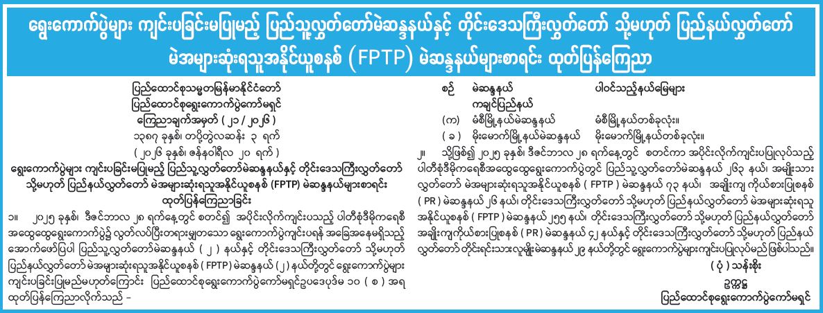 ရွေးကောက်ပွဲများ ကျင်းပခြင်းမပြုမည့် ပြည်သူ့လွှတ်တော်မဲဆန္ဒနယ်နှင့် တိုင်းဒေသကြီးလွှတ်တော် သို့မဟုတ် ပြည်နယ်လွှတ်တော် မဲအများဆုံးရသူအနိုင်ယူစနစ် (FPTP) မဲဆန္ဒနယ်များစာရင်း ထုတ်ပြန်ကြေညာ 01/21/2026