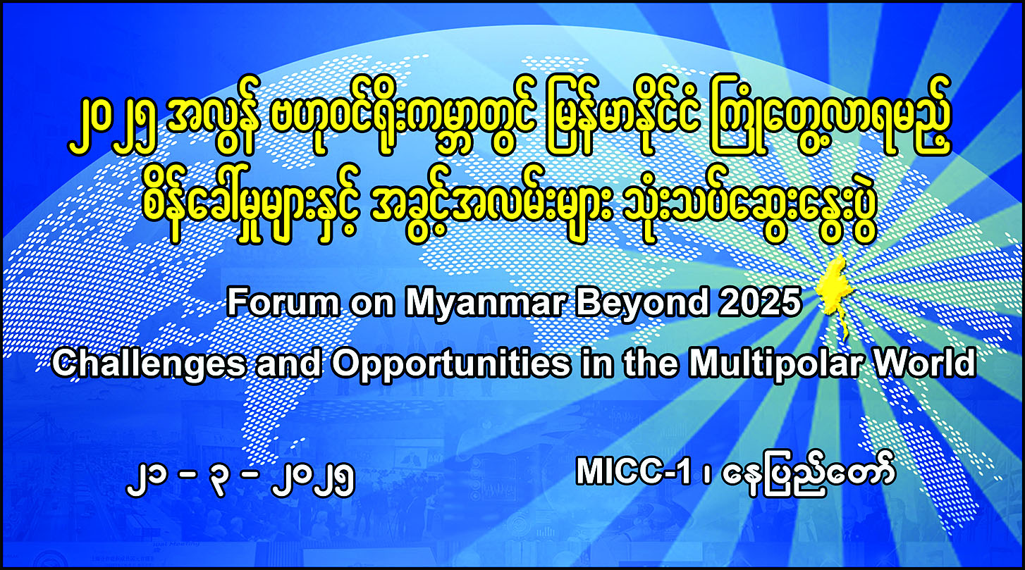 ပြန်ကြားရေးဝန်ကြီးဌာနကကြီးမှူး၍ မြန်မာ့ပုံရိပ်ဖော်ညွှန်းရေးအဖွဲ့ (Myanmar Narrative Think Tank) က စီစဉ်ကျင်းပသော “၂၀၂၅ အလွန် ဗဟုဝင်ရိုးကမ္ဘာတွင် မြန်မာနိုင်ငံကြုံတွေ့လာရမည့် စိန်ခေါ်မှုများနှင့်အခွင့်အလမ်းများ” သုံးသပ်ဆွေးနွေးပွဲ (Forum on Myanmar Beyond 2025: Challenges and Opportunities in the Multipolar World) ကို ၂၀၂၅ ခုနှစ် မတ်၂၁ ရက်တွင် နေပြည်တော်ရှိ မြန်မာအပြည်ပြည်ဆိုင်ရာ ကွန်ဗင်းရှင်းဗဟိုဌာန - ၁ (MICC-I) တွင် ကျင်းပမည်ဖြစ်ကြောင်း သိရသည်။အဆိုပါ သုံးသပ်ဆွေးနွေးပွဲတွင် “ပြောင်းလဲနေသော ဗဟုဝင်ရိုးကမ္ဘာတွင် မြန်မာနှင့်အာရှ၏အခန်းကဏ္ဍ” ၊ “၂၀၂၅ အလွန် ဗဟုဝင်ရိုးကာလတွင် မြန်မာနိုင်ငံကြုံတွေ့ရမည့် ပထဝီစီးပွားရေး စိန်ခေါ်မှုများနှင့် ရရှိနိုင်သည့် အခွင့်အလမ်းများ”၊ “၂၀၂၅ အလွန် ဗဟုဝင်ရိုးကာလတွင် မြန်မာနိုင်ငံကြုံတွေ့ရမည့် ပထဝီနိုင်ငံရေးစိန်ခေါ်မှုများနှင့်ရရှိနိုင်သည့် အခွင့်အလမ်းများ” စသည့် ခေါင်းစဉ်သုံးခုကို တရုတ်၊ ရုရှား၊ အိန္ဒိယ၊ ဂျပန်၊ ထိုင်း၊ အီတလီ၊ နီပေါနိုင်ငံတို့မှ ပထဝီစီးပွားရေးနှင့် ပထဝီနိုင်ငံရေးဆိုင်ရာ ကျွမ်းကျင်ပညာရှင်များနှင့် ပြည်တွင်းမှပညာရှင်များက ပါဝင်ဆွေးနွေးသွားမည်ဖြစ်ပြီး နိုင်ငံတကာမှ လေ့လာသုံးသပ်သူများ (Observers)လည်း ပါဝင်တက်ရောက်သွားမည်ဖြစ်ကြောင်း သိရသည်။
