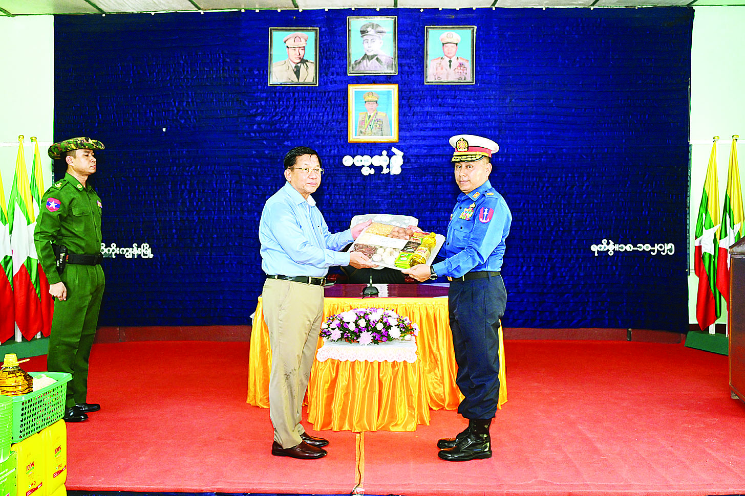 ထို့နောက် နိုင်ငံတော်လုံခြုံရေးနှင့်အေးချမ်းသာယာရေးကော်မရှင်ဥက္ကဋ္ဌ တပ်မတော်ကာကွယ်ရေးဦးစီးချုပ်က တပ်နယ်မှအရာရှိ၊ စစ်သည်မိသားစုများအတွက် စားသောက်ဖွယ်ရာများကိုလည်းကောင်း၊ နိုင်ငံတော်လုံခြုံရေးနှင့်အေးချမ်းသာယာရေးကော်မရှင်ဥက္ကဋ္ဌ တပ်မတော်ကာကွယ်ရေးစီးချုပ်၏ ဇနီးက တပ်နယ်မိခင်နှင့် ကလေးရန်ပုံငွေများကိုလည်းကောင်း ပေးအပ်ရာ ရေတပ်ဌာနချုပ်မှူးနှင့် ဇနီးတို့က လက်ခံရယူကြသည်။