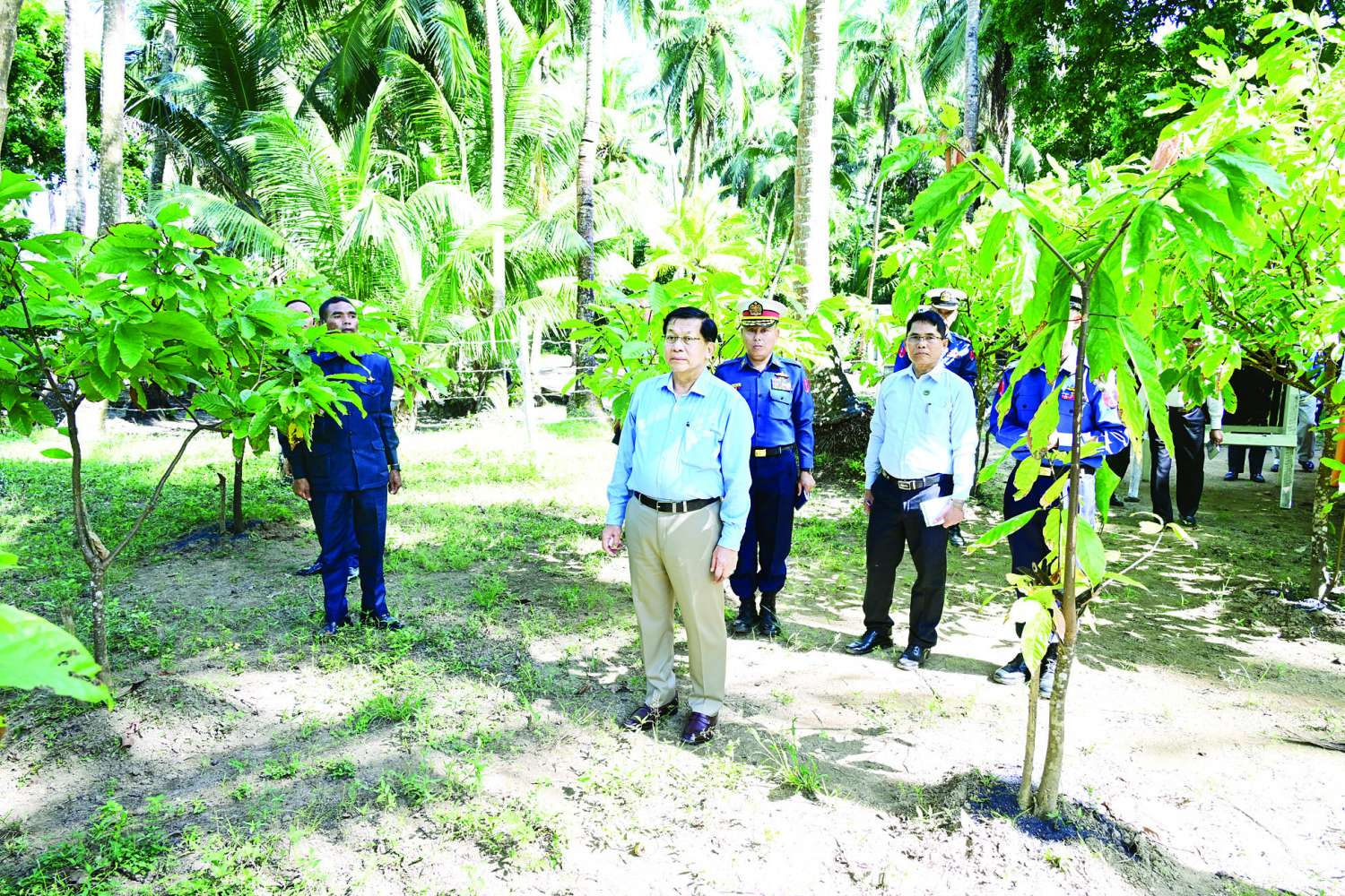 ယင်းနောက် နိုင်ငံတော်လုံခြုံရေးနှင့်အေးချမ်းသာယာရေးကော်မရှင်ဥက္ကဋ္ဌ တပ်မတော်ကာကွယ်ရေးဦးစီးချုပ်နှင့် အဖွဲ့ဝင်မျာသည် နယ်မြေခံရေတပ်စခန်းဌာနချုပ် ကိုကိုးစိုက်ပျိုးရေးခြံသို့ ရောက်ရှိကြပြီး ကိုကိုးပင်များ ရှင်သန်အောင်မြင်ဖြစ်ထွန်းနေမှုကို ကြည့်ရှုစစ်ဆေးပြီး တာဝန်ရှိသူများ၏ တင်ပြချက်များအပေါ် ကိုကိုးပင်များ အားယခုထက်ပိုမိုတိုးတက်စိုက်ပျိုးနိုင်ရေးဆောင်ရွက်သွားရန်၊ ထိုမှတစ်ဆင့် မြေနိမ့်ကော်ဖီကို စမ်းသပ်စိုက်ပျိုးနိုင်ရေး ဆောင်ရွက်သွားရန်နှင့် အခြားလိုအပ်သည်များကို လမ်းညွှန်မှာကြားခဲ့ကြောင်း သတင်းရရှိသည်။
