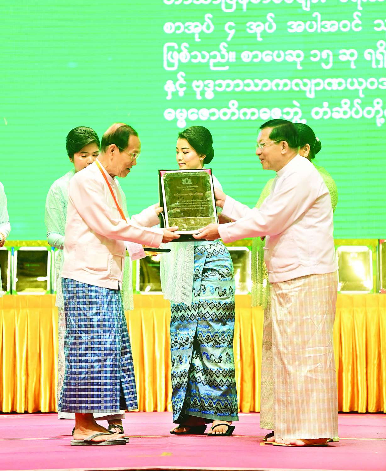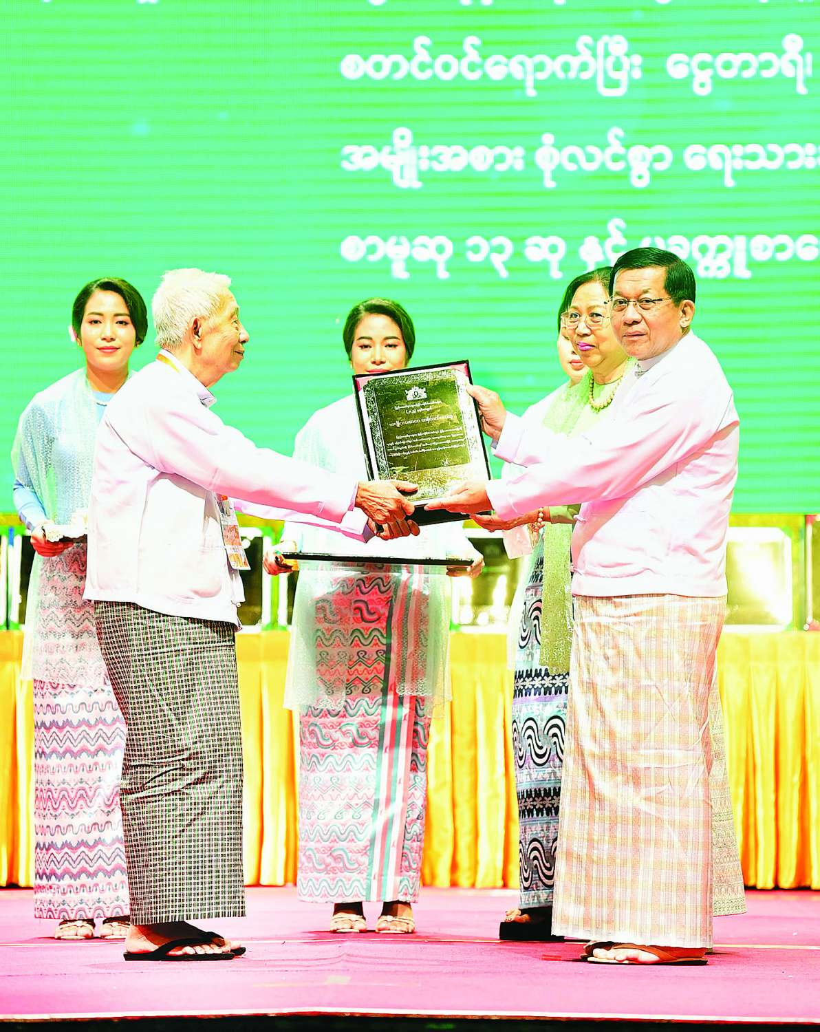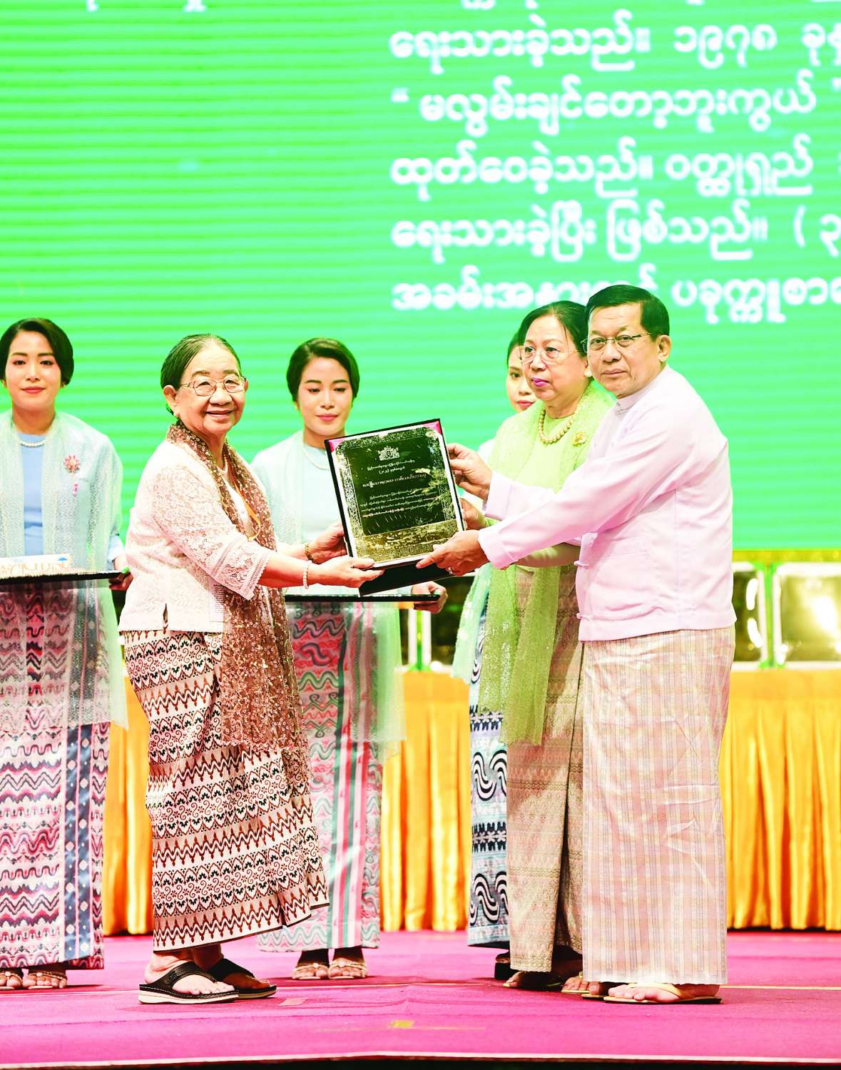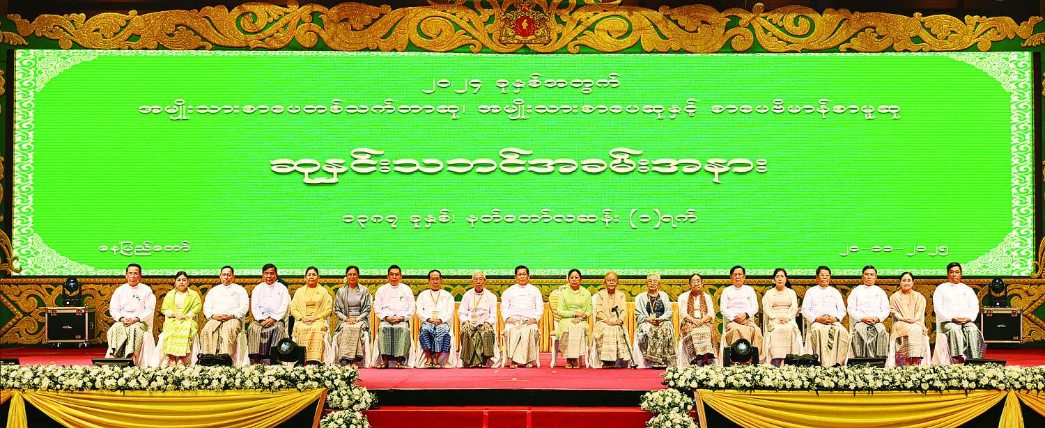 ၂၀၂၄ ခုနှစ်အတွက် အမျိုးသားစာပေတစ်သက်တာဆု၊ အမျိုးသားစာပေဆုနှင့် စာပေဗိမာန်စာမူဆု ဆုနှင်းသဘင်အခမ်းအနားကျင်းပ ပြည်ထောင်စုသမ္မတမြန်မာနိုင်ငံတော် ယာယီသမ္မတ နိုင်ငံတော်လုံခြုံရေးနှင့်အေးချမ်းသာယာရေးကော်မရှင်ဥက္ကဋ္ဌ ဗိုလ်ချုပ်မှူးကြီး မင်းအောင်လှိုင်နှင့်ဇနီး ဒေါ်ကြူကြူလှ တက်ရောက်ချီးမြှင့်ပေးအပ်