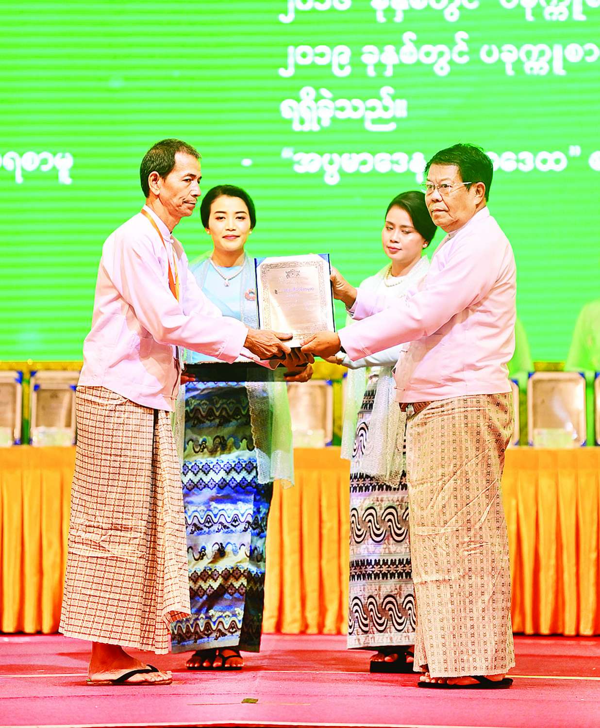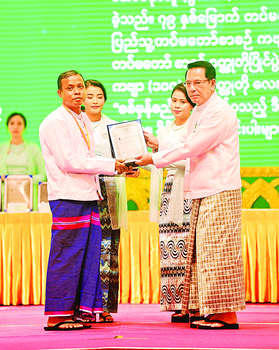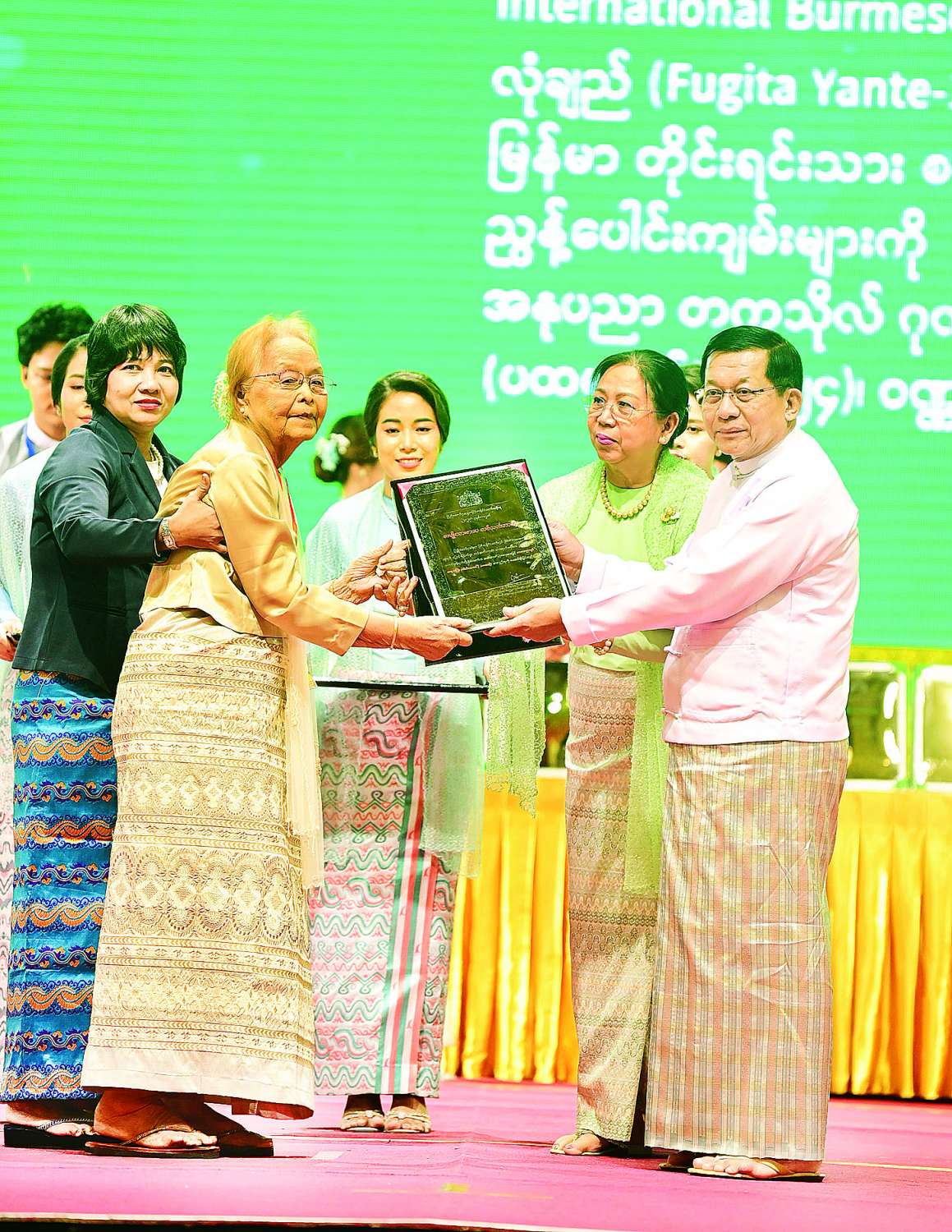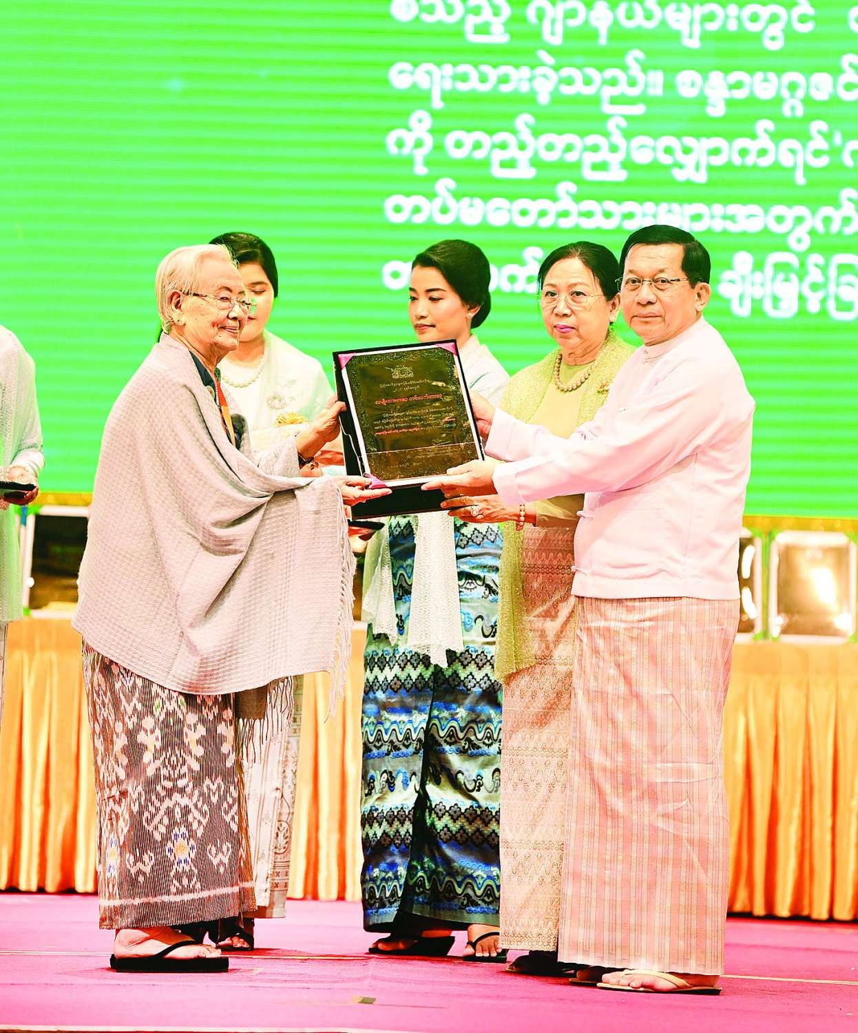 ဆက်လက်၍ နိုင်ငံတော်ယာယီသမ္မတ နိုင်ငံတော်လုံခြုံရေးနှင့် အေးချမ်းသာယာရေးကော်မရှင်ဥက္ကဋ္ဌနှင့် ဇနီးတို့က ၂၀၂၄ ခုနှစ်၊ အမျိုးသားစာပေတစ်သက်တာဆုရရှိကြသည့် စာပေပညာရှင် ဆရာကြီးနှင့် ဆရာမကြီးများဖြစ်ကြသည့် ဦးသန်းညွန့် (ဇင်မင်း-သမိန်ထော)၊ ဦးကိုကို (ကို-တက္ကသိုလ်)၊ ဒေါက်တာ ဒေါ်ပို (မလေးပို)၊ ဒေါ်တင်ရီ (တင်ရီမ-ညောင်ဦး)၊ ဒေါက်တာ ဒေါ်ခင်သန်းဦး (မမိုးမြေ)တို့ကို နိုင်ငံတော်မှ ချီးမြှင့်သည့် ဂုဏ်ပြုမှတ်တမ်းလွှာ၊ ဂုဏ်ပြုချီးမြှင့်ငွေများနှင့် နိုင်ငံတော်ယာယီသမ္မတ နိုင်ငံတော်လုံခြုံရေးနှင့် အေးချမ်းသာယာရေးကော်မရှင်ဥက္ကဋ္ဌနှင့် ဇနီးတို့ကချီးမြှင့်သည့် အထူးဂုဏ်ပြုလက်ဆောင်များကို ပေးအပ်ချီးမြှင့်သည်။