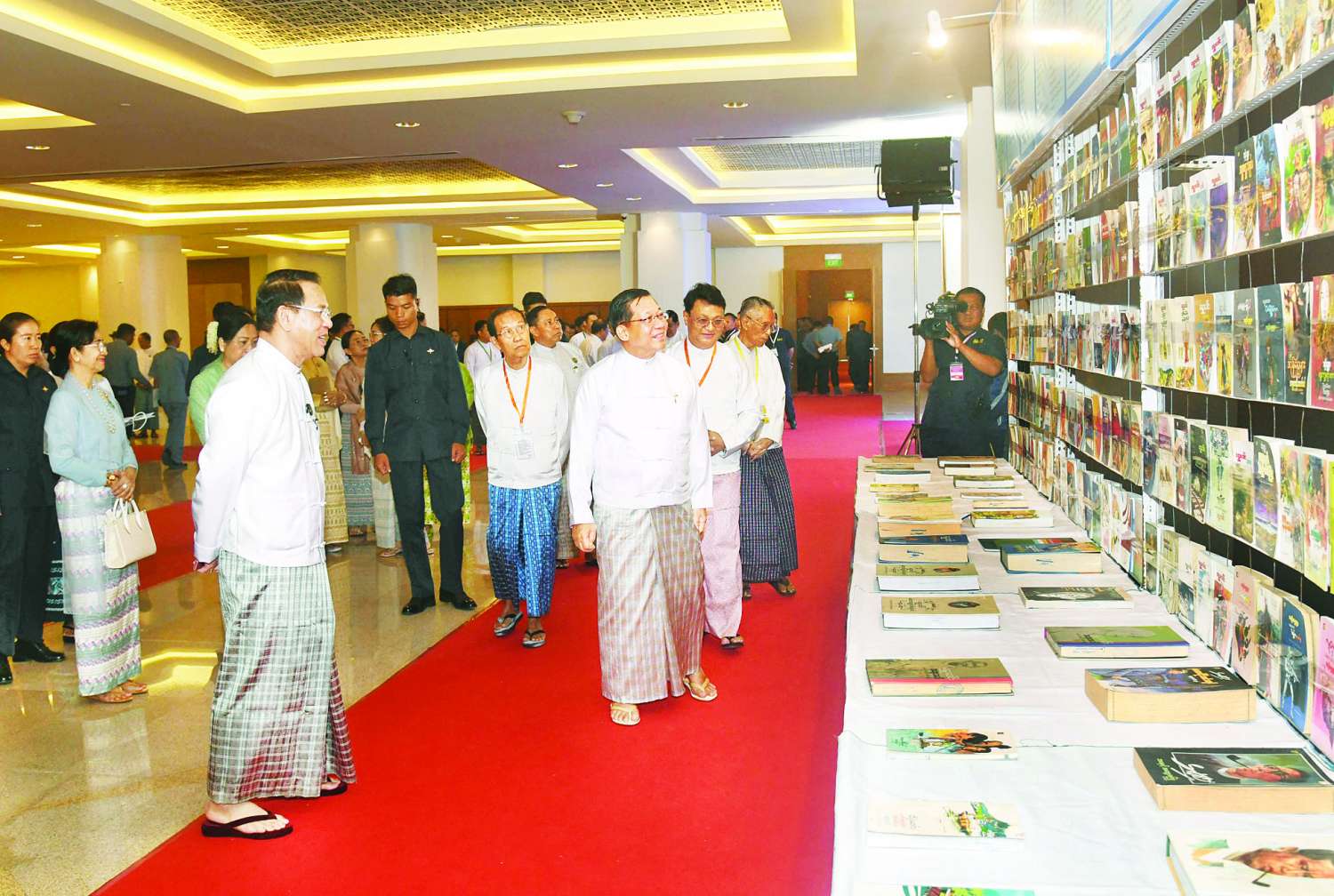 ဦးစွာ နိုင်ငံတော်ယာယီသမ္မတ နိုင်ငံတော်လုံခြုံရေးနှင့်အေးချမ်းသာယာရေးကော်မရှင်ဥက္ကဋ္ဌနှင့်ဇနီး၊ အခမ်းအနား တက်ရောက်လာကြသူများသည် ၂၀၂၄ ခုနှစ်အတွက် အမျိုးသားစာပေတစ်သက်တာဆု၊ အမျိုးသားစာပေဆုနှင့် စာပေဗိမာန်စာမူဆုရရှိကြသူများ၏ အတ္ထုပ္ပတ္တိ၊ ဓာတ်ပုံ၊ ဆုရစာအုပ်များ၊ စာအုပ်စာစောင်နှင့် စာပေဆိုင်ရာပြခန်းများကို လှည့်လည်ကြည့်ရှုကြသည်။