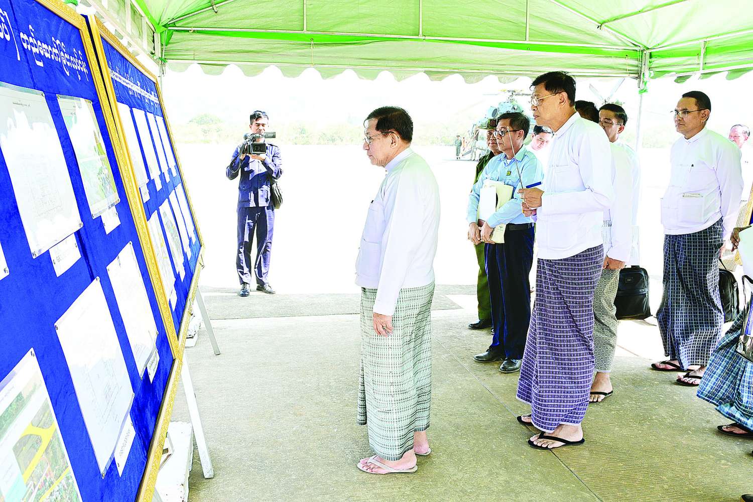 ထို့နောက် နိုင်ငံတော်ယာယီသမ္မတ နိုင်ငံတော်လုံခြုံရေးနှင့်အေးချမ်းသာယာရေးကော်မရှင်ဥက္ကဋ္ဌသည် အနီးစခန်းလေဆိပ်အဆင့်မြှင့်တင်နေမှုအခြေအနေများအား သွားရောက်ကြည့်ရှုစစ်ဆေးခဲ့ပြီး ပို့ဆောင်ရေးနှင့်ဆက်သွယ်ရေးဝန်ကြီးဌာန ပြည်ထောင်စုဝန်ကြီး ဦးမြထွန်းဦးနှင့် တာဝန်ရှိသူများ၏ တင်ပြချက်များအပေါ် လုပ်ငန်းများ ဆောင်ရွက်ရာတွင် နောင်ဖြစ်ပေါ်လာမည့် ခရီးသွားလာမှု၊ ကုန်စည်ကူးသန်းရောင်းဝယ်မှုနှင့် ဖွံ့ဖြိုးတိုးတက်မှုတို့ကိုကြည့်၍ ရေရှည်အကျိုးရှိစေရေး စနစ်တကျ တွက်ချက်ဆောင်ရွက်သွားရန်နှင့် အခြားလိုအပ်သည်များ လမ်းညွှန်မှာကြားခဲ့ကြောင်း သတင်းရရှိသည်။