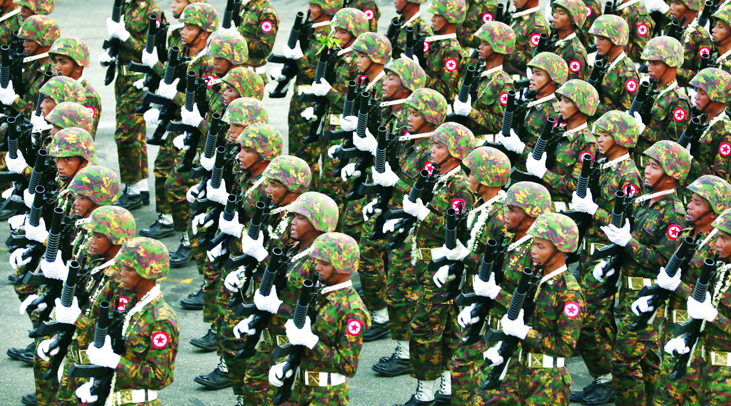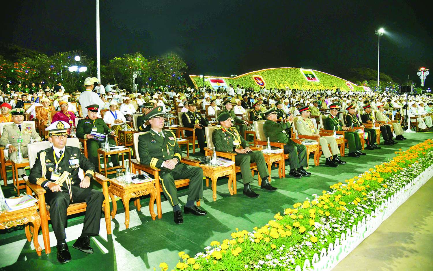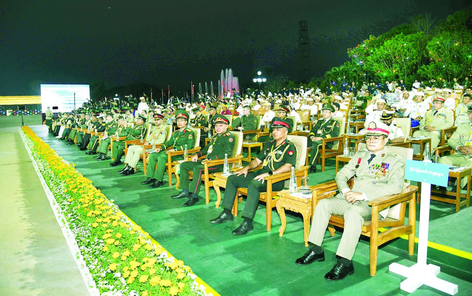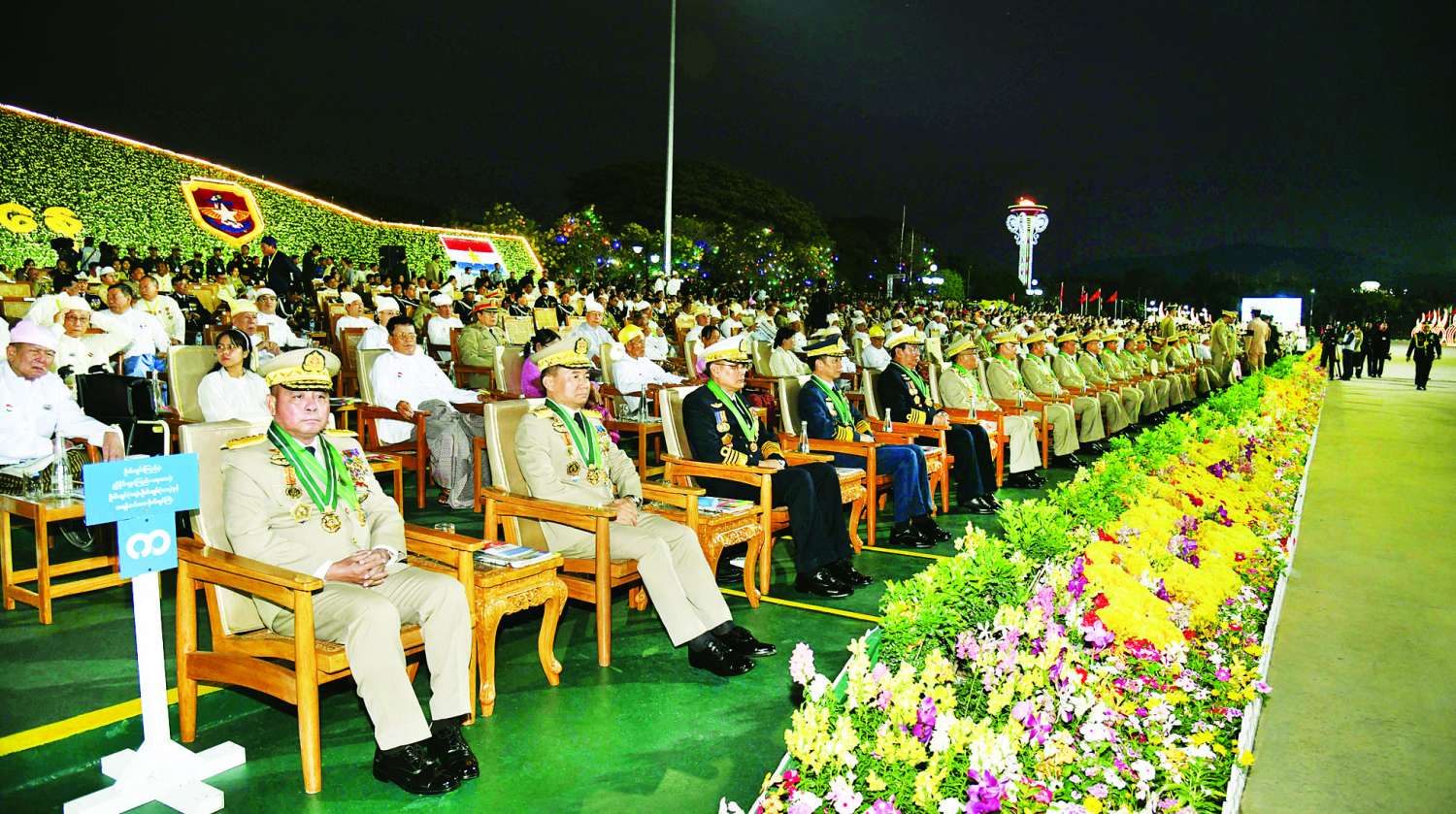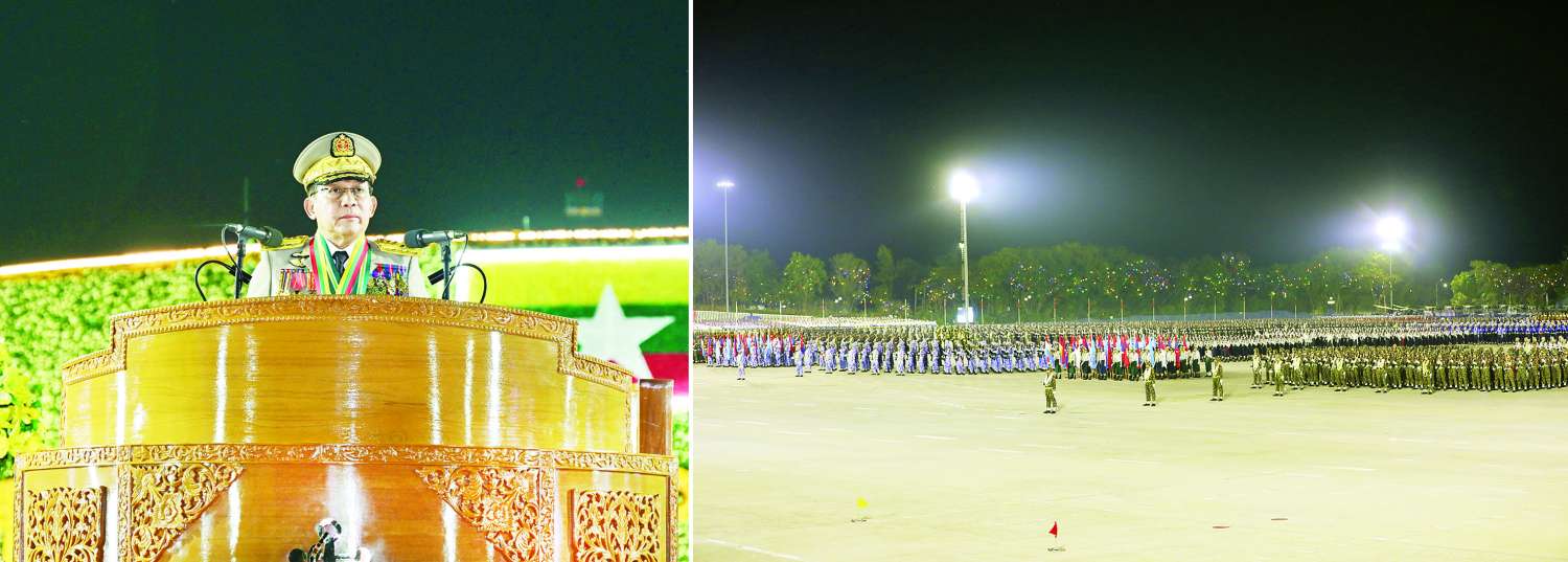 (၈၁) နှစ်မြောက် တပ်မတော်နေ့စစ်ရေးပြအခမ်းအနားကို ယနေ့ညပိုင်းတွင် နေပြည်တော်စစ်ရေးပြကွင်း၌ ကျင်းပပြုလုပ်ရာ နိုင်ငံတော်လုံခြုံရေးနှင့် အေးချမ်းသာယာရေးကော်မရှင်ဥက္ကဋ္ဌ တပ်မတော်ကာကွယ်ရေးဦးစီးချုပ် ဗိုလ်ချုပ်မှူးကြီး သတိုးမဟာသရေစည်သူ သတိုးသီရိသုဓမ္မ မင်းအောင်လှိုင် တက်ရောက်မိန့်ခွန်းပြောကြားသည်။