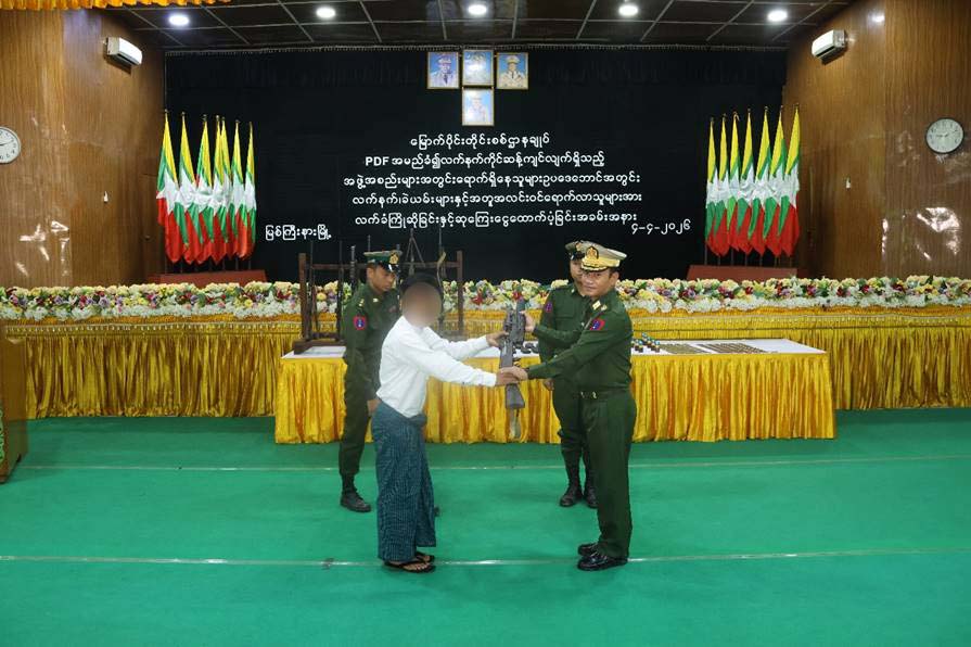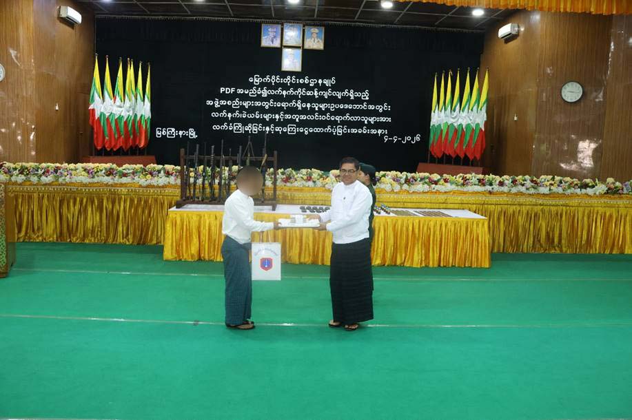 နိုင်ငံတော်အစိုးရသည် PDF အပါအဝင် အဖွဲ့အစည်းအမျိုးမျိုးအမည်ခံ၍ လက်နက်ကိုင်ဆန့်ကျင်လျက်ရှိသည့် အဖွဲ့အစည်းများအတွင်း ရောက်ရှိနေသူများအား ဥပဒေဘောင်အတွင်းသို့ ပြန်လည်ဝင်ရောက်ရန်ဖိတ်ခေါ်၍ ဥပဒေဘောင်အတွင်းသို့ ပြန်လည်ဝင်ရောက်လာကြသူများကိုလည်း လိုအပ်သည့် ကူညီပံ့ပိုးမှုများ ဆောင်ရွက်ပေးလျက်ရှိရာ နိုင်ငံတော်နှင့် တပ်မတော်၏ငြိမ်းချမ်းရေးလုပ်ငန်းစဉ်များကို နားလည်သဘောပေါက်လာသည့် KIA ၊ KPDF နှင့် PDF အမည်ခံအဖွဲ့မှ အဖွဲ့ဝင်အမျိုးသား ၈ ဦးတို့သည် လက်နက်ခဲယမ်းများနှင့်အတူ ဥပဒေဘောင်အတွင်းသို့ ထပ်မံဝင်ရောက်လာကြသည်။