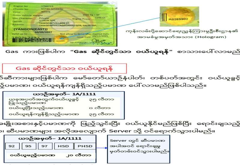 စက်သုံးဆီဝယ်ယူရာတွင် စက်စွမ်းအားအလိုက် ဝယ်ယူခွင့်ပမာဏကိုသတ်မှတ်ပြီး ပိုမို၍ပြည့်စုံသည့်စနစ်ဖြင့် နေပြည်တော်ကောင်စီနယ်မြေ၊ ရန်ကုန်မြို့၊ မန္တလေးမြို့နှင့် တောင်ကြီးမြို့များတွင် ၂၇-၃-၂၀၂၆ ရက်နေ့မှစ၍ ရောင်းချသွားမည်ဖြစ်ပြီး ကျန်မြို့များတွင်လည်း ယခုစနစ်အား ဆက်လက်အကောင်အထည် ဖော်ဆောင်ရွက်သွားမည်ဖြစ်ပါသည်။